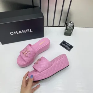 Chanel Lambskin Quilted CC Mules Wedge Sandals with OG Box & Dust Bag Pink For Women