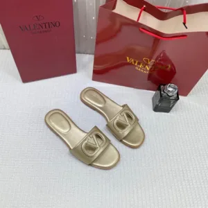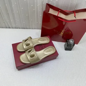 Valentino Garavani VLogo Signature Flat Leather Sandals Gold with OG Box & Carry Bag Gold For Women
